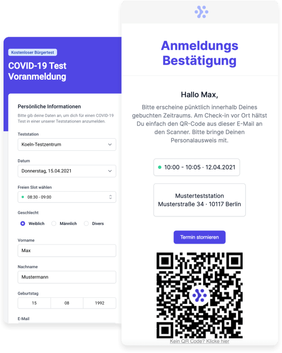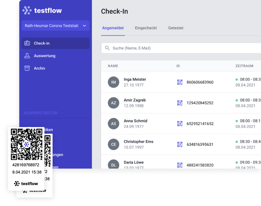 Für mehr Geschwindigkeit am Check-in. Spontane Laufkundschaft und ältere Menschen ohne Smartphone können über Testflow innerhalb weniger Sekunden vollständig erfasst und eingecheckt werden.